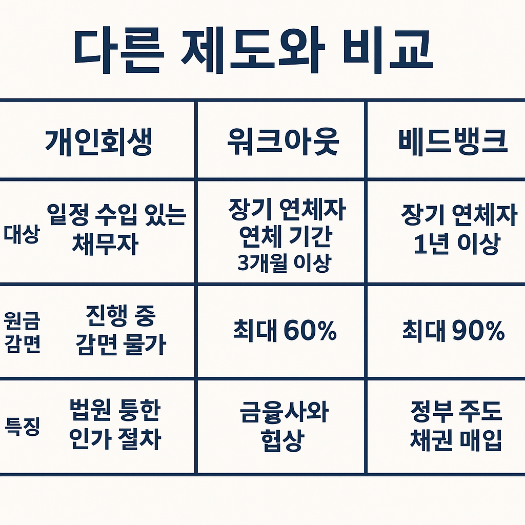 즉, 기존 제도로도 지원이 가능하지만, 배드뱅크는 장기 연체자 맞춤형 제도라는 점에서 차별화됩니다.