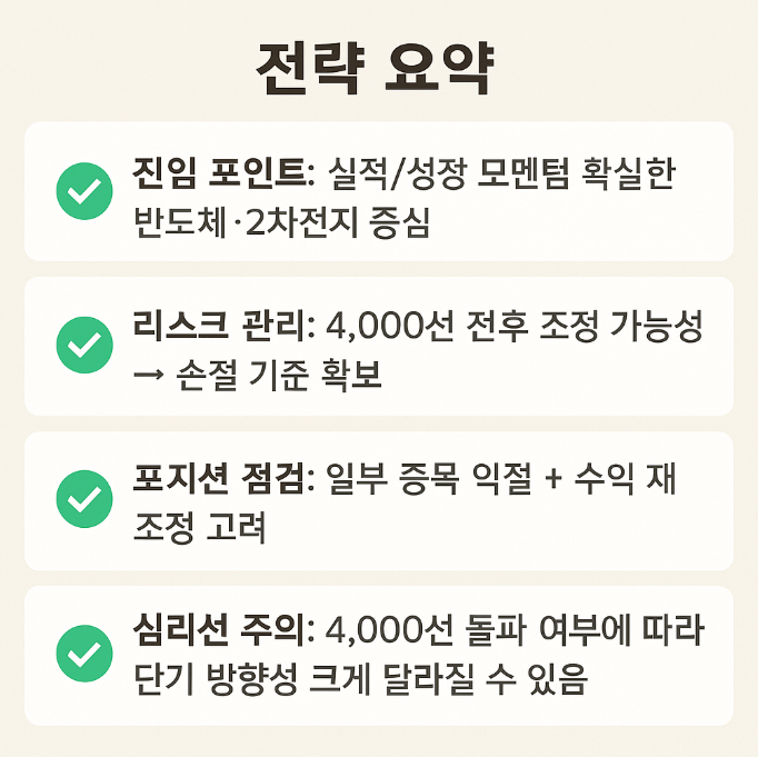 - 리스크 관리: 4,000선 전후 조정 가능성 → 손절 기준 확보